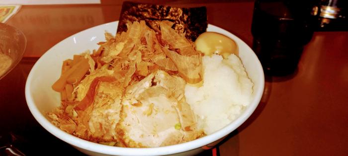 元祖おろしつけ麺は、具材は、メンマと、花鰹と、焼き海苔と、魚粉と、大根おろし、焼き海苔と、魚粉かな⁉️