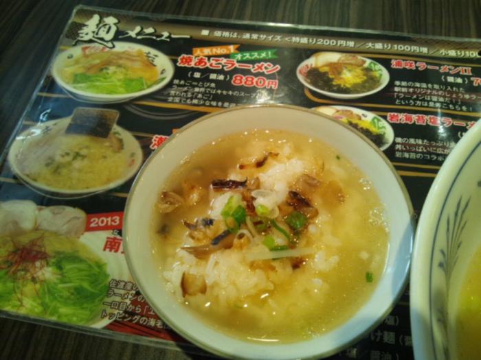 久々ということもあり、あまりの期待の大きさだったのでしょう。ラーメンの方の写真を撮ることなどすっかり忘れてまして、写真は煮干飯です。ラーメンの焼きあご塩スープをかけてアッサリおじや風にして充実のランチでした。
