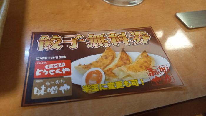 スマホのアプリで、ラーメン巡りのアプリのクーポン券で、期間限定のアップグレードで、餃子3個と煮卵1個を両方を無料でもらいました。