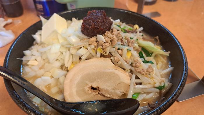 会社帰りに、無性にお腹が空いたので、味パチンコエスタリオンさんの敷地ないの味噌や味噌やさんで、辛味噌ラーメンと、刻みタマネギとバターを入れて戴きました。