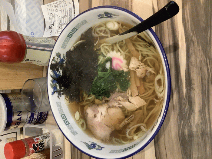 らぁめん天山見附店、醤油らぁめん(クロレラ麺)792円。新店舗になってから、新しくなった点がいくつかあります。開店時間10:00、麺は中盛まで無料、大盛は100円増し、麺はクロレラ麺か太麺を選択、ライスが無料、味噌は赤味噌か白味噌を選択、小上がり席はタブレットで注文します。