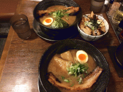 かさね醤油ラーメン×2ぎょうざチャーシュー丼を女2人で食べました。ラーメンに乗っているチャーシューがとても大きく、さすがに食べきれませんでした。スープはこってりしていましたが、麺と食べるとスルスル入り、